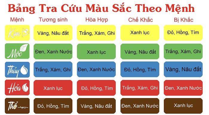 Bảng tra cứu màu sắc theo mệnh, tương sinh, tương khắc
