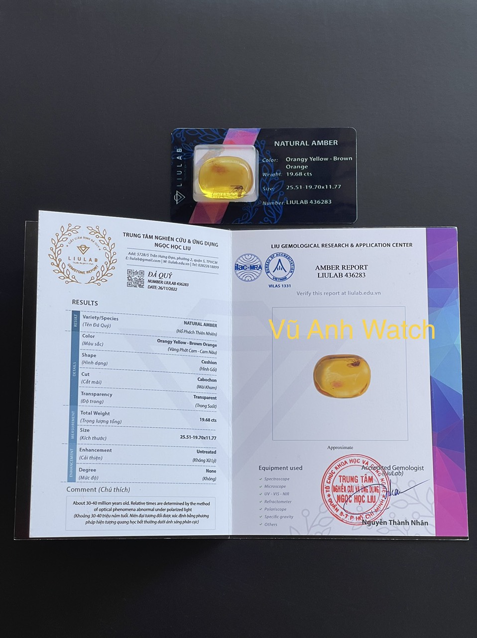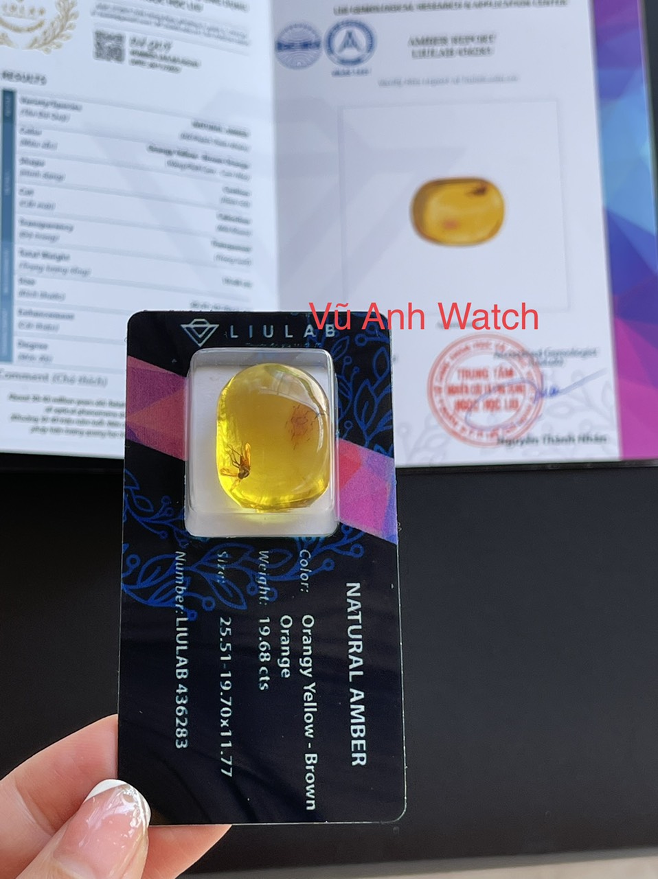 Hổ Phách Vũ Anh xin giới thiệu đến toàn thể anh chị em yêu Hổ Phách tự nhiên một viên Hổ Phách tự nhiên ngậm côn trùng cổ đại to khổng lồ 30 - 40 triệu năm tuổi đã được kiểm định tại Trung tâm nghiên cứu và ứng dụng ngọc học Liu.