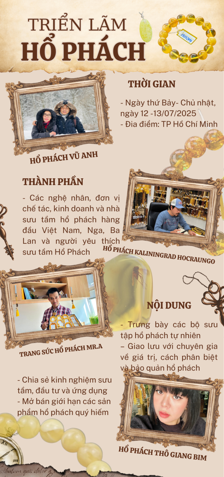 Các nhà sưu tầm lâu năm sẽ chia sẻ kinh nghiệm chọn lựa, tích lũy Hổ Phách để gia tăng giá trị theo thời gian, cũng như ứng dụng Hổ Phách trong không gian sống, phong thủy.