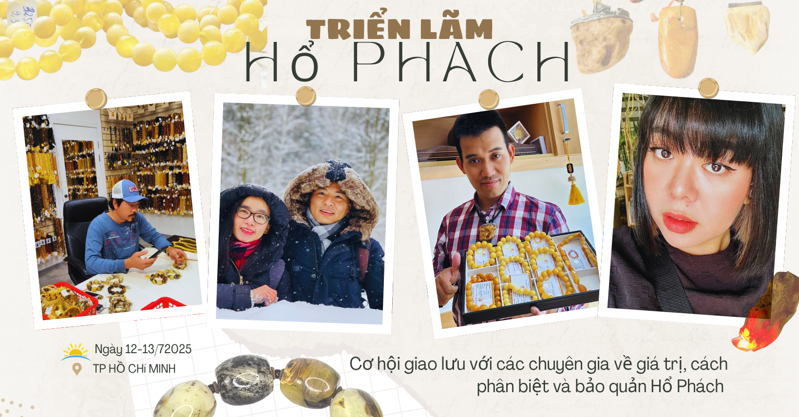 Khám phá thế giới Hổ Phách tự nhiên tại Triển lãm giao lưu Hổ Phách TP.HCM ngày 12-13/07/2025. Chiêm ngưỡng bộ sưu tập quý hiếm, giao lưu chuyên gia, chia sẻ kinh nghiệm sưu tầm – đầu tư, mở bán giới hạn cùng ưu đãi đặc biệt. Đừng bỏ lỡ sự kiện đẳng cấp dành riêng cho những tín đồ đá quý, phong thủy và mỹ nghệ cao cấp!